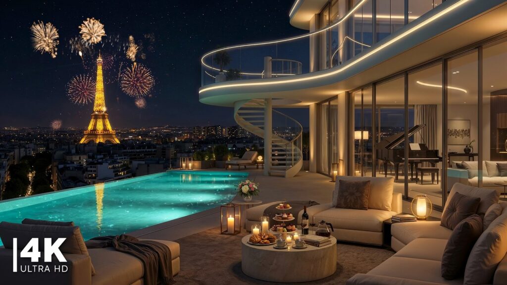 Soft Jazz Piano Music & Beautiful Firework for Relax, fournis par l’auteur. La description détaillée est la suivante :« Ambiance nocturne parisienne confortable dans un appartement de luxe | Musique de piano jazz douce et beau feu d’artifice pour se détendre